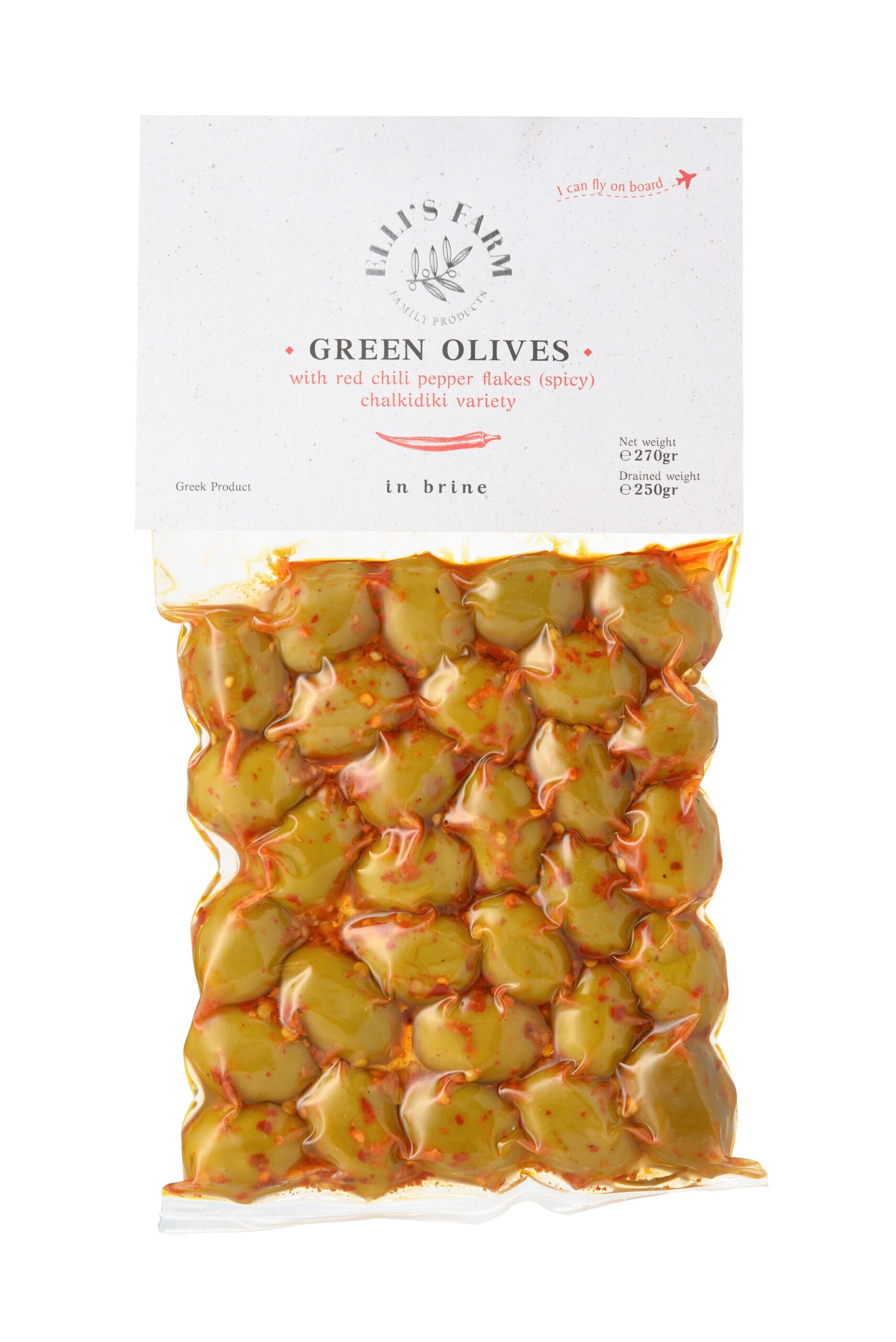 Ingredients: Olives, Brine (water, salt), Red chili Pepper Flakes, Lactic Acid, Citric Acid (acidity regulator).