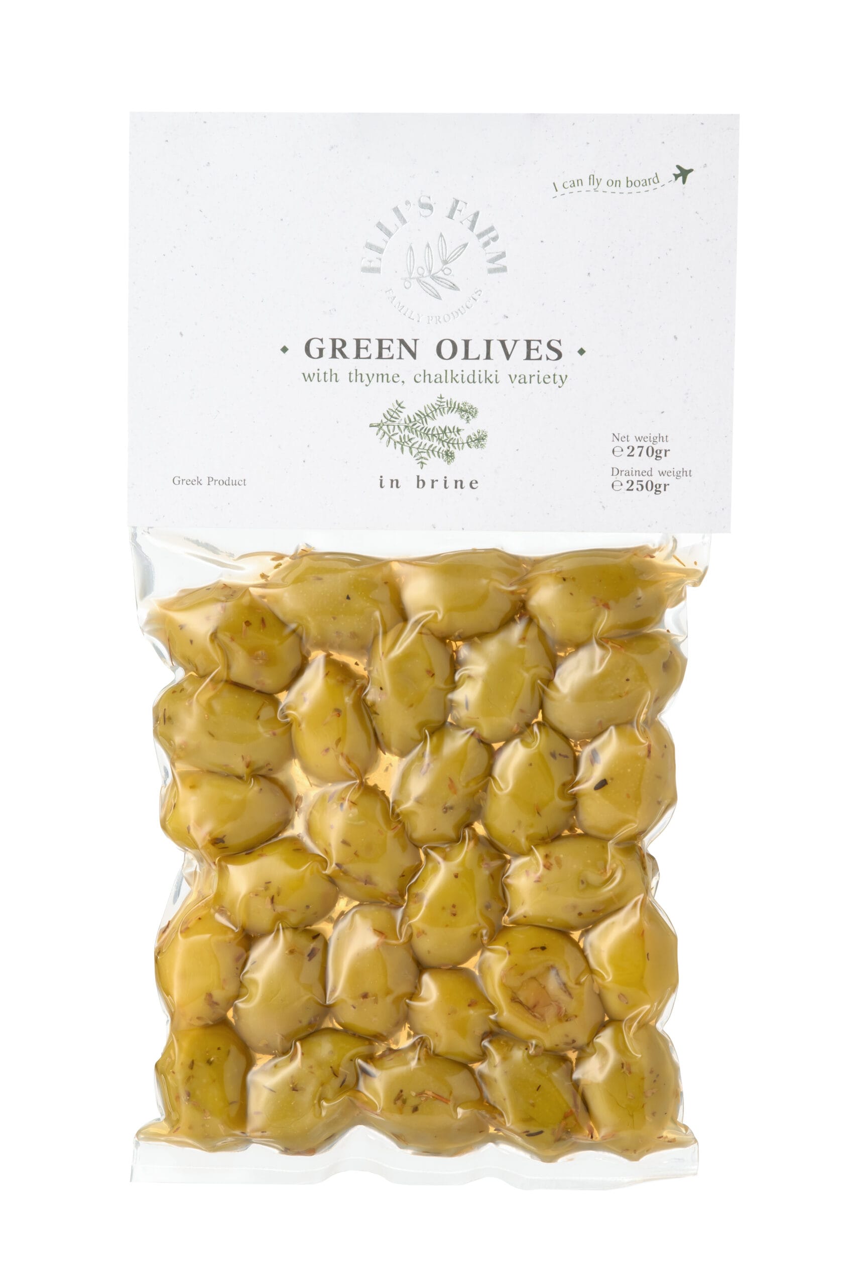 Ingredients: Olives, Brine (water, salt), Thyme, Lactic Acid, Citric Acid (acidity regulator).